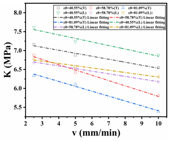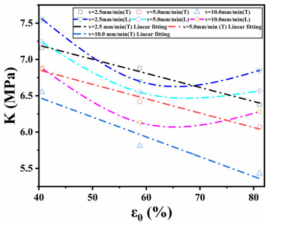 Figure 7 presents the linear relationship between and tensile rate v at three initial strains. The linear function K = av + b was used for fitting, and the fitting parameters are described in Table 3. As shown, all the correlation coefficients exceeded 0.96, verifying the accuracy of fitting results. Moreover, the viscoelastic parameter decreased linearly with the tensile rate, that is, the lower the tensile rate, the more obvious the viscoelasticity.