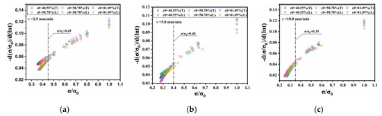 In addition to −dσ/dt, −d(σ/σ0)/d(lnt) and −dσ/d(lnt) are also frequently adopted to characterize the stress relaxation rate in the dynamics on stress relaxation of polymers [39]. Figure 9 presents the stress-relaxation rate expressed by −d(σ/σ0)/d(lnt) at three tensile rates. As observed, the stress-relaxation rate was positively correlated with σ/σ0, the initial relaxation rate reached the maximum at 58.78% strain and the minimum at 81.09% strain at identical tensile rates, and the longitudinal specimens had higher values than the transverse specimens. The relaxation stress is related to the initial stress σ0 and the relaxation time, and σ0 depends on the tensile rate and initial strain. The comparison shows that the specimen at a larger tensile rate has a higher initial stress-relaxation rate.