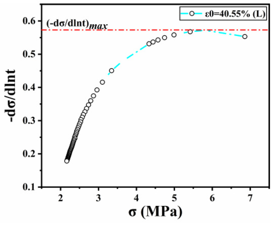 The residual stress can be derived from the stress relaxation curves at different tensile rates and initial strains. The residual stress can be determined as follows: Firstly, plot the −dσ/dlnt versus σ curves in Figure 10 and establish the maximum of −dσ/dlnt. Secondly, plot (−dσ/dlnt)max against of the longitudinal and transverse specimens in Figure 11a,b. Finally, connect the points at different initial strains but the same tensile rate and fit them with a straight line, and its intercept is regarded as . This is because the polymers should first overcome before the relaxation activation energy barrier under constant strains. In other words, as the initial stress less than is applied, the polymers fail to deform. Therefore, the residual stress corresponds to the initial stress when (−dσ/dlnt)max extrapolated to zero. Figure 11a,b display the relationship between (−dσ/dlnt)max and σ0 of longitudinal and transverse specimens, respectively. The initial stresses of transverse specimens at different tensile rates were close to zero, indicating that no residual stress exists or has been relaxed in the transverse direction. However, those of longitudinal specimens were approximately −0.98 Mpa, indicating that in the longitudinal direction is 0.98 Mpa. This may be explained by the fact that as the PVC GMBs in the longitudinal direction are subjected to the traction by roller crimping, molecular orientation appears at a high temperature. Nevertheless, it does not return in time as the temperature quickly reduces at the extrusion exit, resulting in the stored stress in the material. Due to no crimping traction in the transverse direction, the PVC GMBs are not constrained, and hence no molecular orientation exists as the temperature reduces.