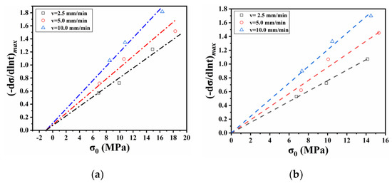 Relationship between (−dσ/dlnt)max and σ0: (a) longitudinal specimens; (b) transverse specimens.