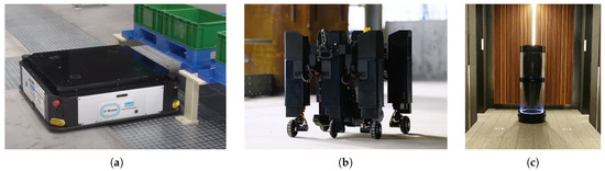Practical omnidirectional robot. (a) “AiTran” developed by DAIHEN Corporation, can be used not only for loading but also for towing cage carts and substituting for forks and can be widely applied to various objects and scenes in factories . (b) Robot under development by Sony Corporation and Shimizu Corporation to improve the efficiency of construction management tasks such as patrolling and monitoring at construction sites . (c) “Display Robot” developed by THK Corporation and Yoshityu Mannequin Corporation for customer service and advertising activities in commercial facilities, hotels, and airports . ( https://www.youtube.com/watch?v=IPszY3uGrt8, accessed on 19 January 2023. https://www.sony.com/ja/SonyInfo/News/Press/202112/21-1214/, accessed on 19 January 2023. https://products.thk.com/jp/ja/news/products/article-01102020-1.html, accessed on 19 January 2023).
