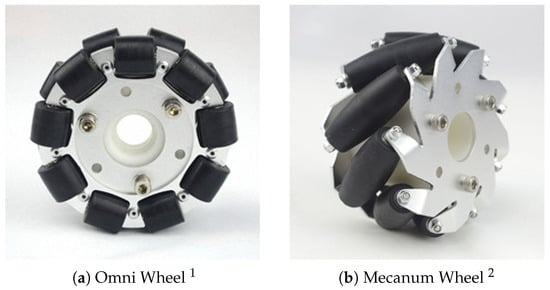 The example of omnidirectional wheels. ( https://www.nexusrobot.com/product/4-inch100mm-double-aluminum-omni-wheel-bearing-rollers-14054.html, accessed on 18 January 2023. https://www.nexusrobot.com/product/4-inch-100mm-mecanum-wheel-rightbearing-rollers-14094r.html, accessed on 18 January 2023).