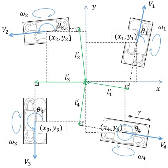 Thus, the robot’s straight-line direction can be estimated by the ratio of the sum of the velocity moments in the x- and y-directions. Since Equation (10) is valid for any number of wheels, it can be applied to any wheel arrangement. In other words, even a robot that cannot move normally due to motor failure may be controlled to move straight ahead.
