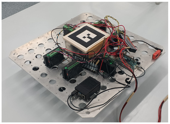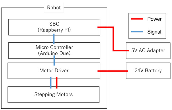 The hardware configuration of the robot is shown in Figure 6. Stepping motors are used to drive the robot because it is easy to control its speed. An Arduino Due is used to generate the pulse-width-modulated (PWM) signals required to control the motor drivers. In addition, a Raspberry Pi 4 was used as the control PC. While it is possible to directly generate PWM signals using the Raspberry Pi 4’s general-purpose input/output pins, eliminating the need for the Arduino Due, we decided to include the Arduino for its more stable PWM signal generation. To control several motors, the Raspberry Pi 4 requires the use of PWM signals generated by software, which are prone to errors due to delays caused by communication and other factors. To avoid this possible source of errors, we developed a speed control library that is not affected by these delays, using hardware-generated PWM signals from the Arduino Due. This library can specify signals up to 500 kHz, which is more precise than the 10 kHz wiringpi (http://wiringpi.com/reference/software-pwm-library/, accessed 19 January 2023), the Raspberry Pi’s library. The library for speed control is available on GitHub (https://github.com/hijimasa/stepper_pulse_generator_for_arduino_due, accessed on 16 January 2023). The power to the motor drivers and electronic boards is supplied externally to withstand long hours of experimentation. The Raspberry Pi 4 and Arduino are connected via USB. An AR marker is placed in the center of the robot. The AR marker is used to acquire the robot’s position during the motion verification experiment. The AR marker was generated by a Robot Operating System package (http://wiki.ros.org/ar_track_alvar, accessed on 28 November 2022). ROS was also used to control the robot and acquire the marker location during the experiment.