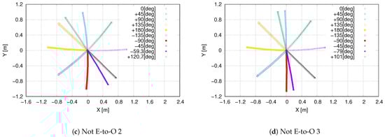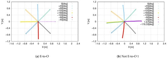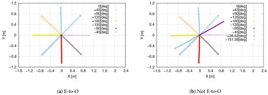 To check the robot’s behavior not only in the front-back and left-right directions but also in the diagonal direction, the robot’s movement direction was set to 8 directions, and the path length was set to 1 m. The path length was selected to fit the camera’s field of view. The front of the robot is assumed to be the x-axis positive direction, and the robot’s initial position is set to the origin.