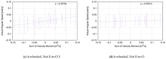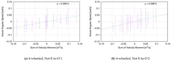 The relationship between the sum of the velocity moments generated by the command velocity and the angular velocity is shown in Figure 11. The figure shows that the two values are proportional and that the proportionality constant depends on the wheel arrangement. The proportionality constant can be the sensitivity to the sum of the velocity moments.