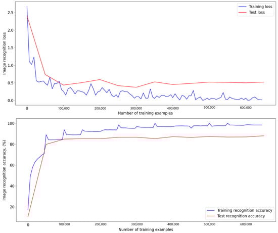 Table 2 shows the accuracies of pretrained architects to justify the choice of the basis of the image recognition program. A total of 20 epochs of each architectural network was trained and the highest value was chosen. The table shows that the best learning outcome was the VGG16 architecture. For 13 training epochs, the network recognized 8799 out of 10,000 test images, and thus the network reached a maximum accuracy of 87.99%, and the error at this epoch was 0.5190 (