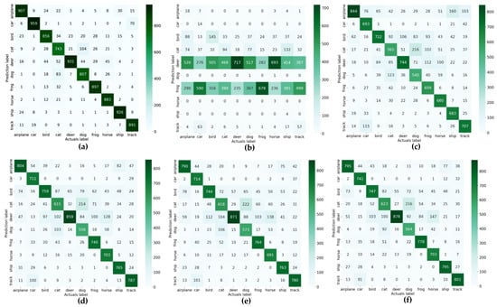 Confusion matrices for the recognition of the CIFAR10 base, noisy with 25% random-valued impulse noise, are shown in