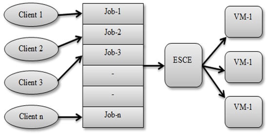 This algorithm uses the concept of a distributed spectrum and operates in such a form that the number of available activities in each virtual machine is equal at any moment. The scheduler retains a virtual machine allocated table that holds the virtual machine’s IDs and counts of the virtual machine for current tasks. Active task counts belonging to that virtual machine in the allocations tables will be changed with the assignment of new tasks or on fulfillment of tasks. An active task count for each virtual machine is 0 at the start. Upon entry of the mission, the ESCE scheduler notices a minimum virtual machine that is engaged in mission numbers. If more than one virtual machine has the lower active counting then the first listed virtual machine for job assignment is chosen. Task queues shall be controlled according to each virtual machine [19]. Figure 2 depicts the process of assigning a new virtual machine from the data center controller; the strategy selects a virtual machine from the index with the lowest load value (if the strategy detects two or more virtual machines with the same value, it selects the first detected virtual machine), and then the strategy sends the selected virtual machine ID to the data center controller [1].