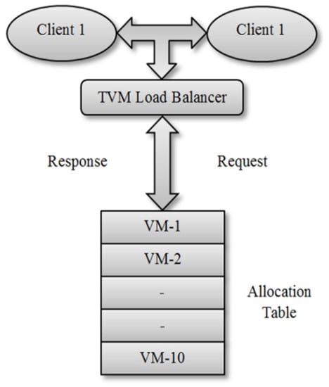 This is one of the simpler schedule techniques which uses the time-slicing concept. Here, the duration is split into several segments, and each node is assigned a different time-slicing or time range, i.e., it uses the timing schedule rule. Every node is assigned an action and a quantum [18]. Time quantum is the main consideration for LB algorithms [33]. The RR algorithm is the same as the first-come-first-served algorithm. Furthermore, when the time quantum is insufficient, the RR algorithm is referred to as a processor-sharing algorithm [17]. The service providers provide services to the requested customer on a time-slicing plan [18]. The procedure of virtual machines running in an RR model is depicted in Figure 1 [1].