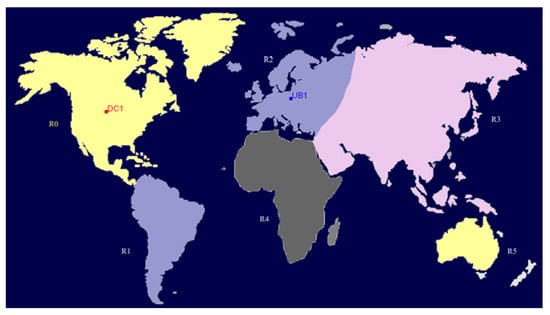 A service broker determines that the data center will supply the support for customers’ demands. Additionally, the service broker manages the flow of data through consumer and data centers [12]. The service broker acts above this stage as a moderator between the customers and cloud service providers [42]. SBP distributes the services dynamically between the cloud infrastructure and cloud service providers [36] or, in plain terms, it is the choice strategy for the data center [12]. The layout of the virtual machine to the physical machine in the data center is termed virtual machine deployment and is a very critical part of the data center broker [37]. One could consider what kind of situation the SBP operates in. The figure shows certain data centers and users. After demand from the customer, the SBP helps to determine which data center will be offering the service for potential demand [12]. Figure 4 displays the data centers which are spread geographically [13].