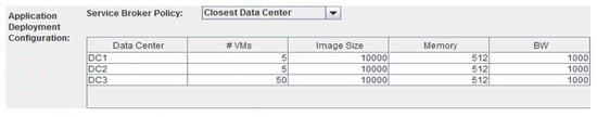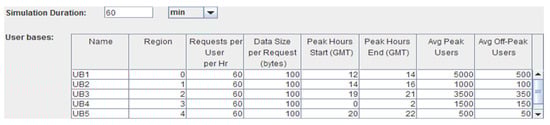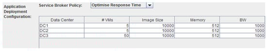 The dataset of the simulated application is represented by the configuration values for inputs. These values are based on six user bases. Figure 7 depicts the setting values for six user bases (location–peak–hours–user number). The findings show how each of the four LB algorithms (PSO, RR, throttled, and ESCE) performs with each of the three service broker policies (CDC, ORT, and reconfigure dynamically with load). The cloud analyst tool was used to analyze the various LB algorithms. To implement the various algorithms, the simulated environment operated by taking six user bases and three data centers, having five virtual machines in Data Center 1 and Data Center 2, and fifty virtual machines in Data Center 3. Each simulation was performed for 60 minutes. They considered average peak users as 500, 1500, 1000, 35,000, and 5000, and average off-peak users to be 50, 100, 150, 350, and 500 in user bases. The SBP used for simulation was CDC, which optimizes response time, and reconfigures dynamically with the load. The deployment setup is shown in Figure 8, Figure 9 and Figure 10.