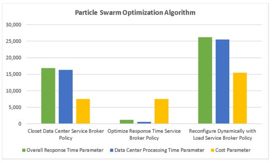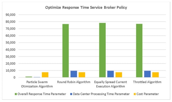 In this section, the paper’s contribution will be compared with the state-of-the-art techniques currently used in cloud analysts, with a focus on the PSO that is typically implemented by IaaS, SaaS, and PaaS cloud providers. In particular, the overall response time, DCPT, and cost of the different solutions based on service broker policies will be investigated. Moreover, RR ESCE and throttled algorithms will also be analyzed.