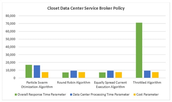 - Khodar, A.; Mager, V.E.; Alkhayat, I.; Al-Soudani, F.A.; Desyatirikova, E.N. Evaluation and Analysis of Service Broker Algorithms in Cloud-Analyst. In Proceedings of the 2020 IEEE Conference of Russian Young Researchers in Electrical and Electronic Engineering (EIConRus), St. Petersburg, Russia, 27–30 January 2020; pp. 351–355. [Google Scholar]