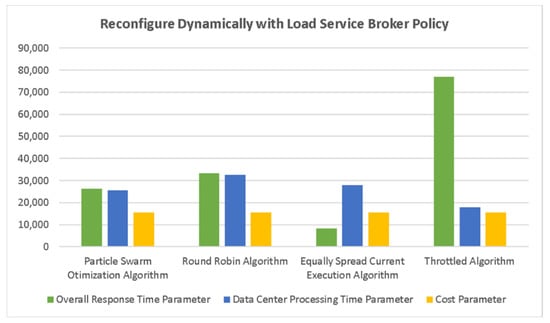 The findings compare the PSO, RR, ESCE, and throttled LB algorithms by taking into account overall response time, DCPT, and cost parameters for each of the CDC, optimizing response time, and reconfiguring dynamically with load service broker policies.