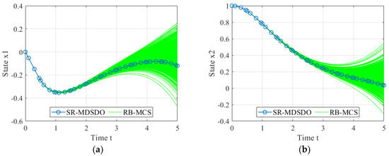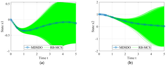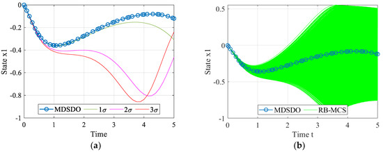 The uncertainty influence on state trajectories under MDSDO. (a) State trajectories of x1. (b) State trajectories of x2.