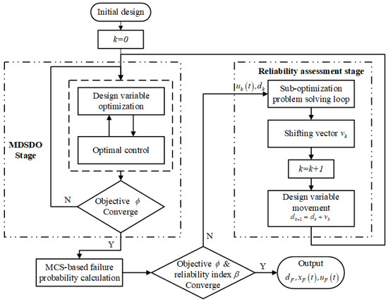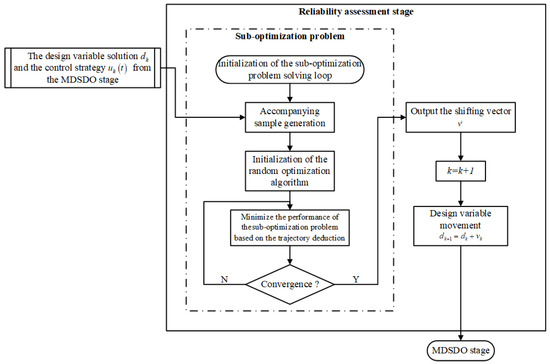In C-MDSDO, the available co-design algorithm is first employed to obtain a deterministic solution, which is applied for the reliability assessment in the following stage. The reliability assessment is based on a constructed sub-optimization problem, in which the stochastic optimization algorithm is used to obtain the shifting vector. With the assistance of the shifting vector, the constraints of the deterministic MDSDO problem are gradually modified, and the constraints are used for the next iteration. When the objective and reliability index converge, the solution to the MDSDO problem satisfying the reliability index is obtained. This decoupled sequence framework effectively avoids nesting reliability assessments in complex dynamic discipline optimization. The flowchart of C-MDSDO is shown in Figure 3.