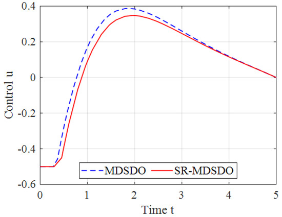 The Van Der Pol Oscillator [30] is a classical numerical case of optimal control with two design variables, two state variables, and one control variable . In OCP, the design variables are usually taken to be constant values before further trajectory optimization. In this paper, the design variables were also treated as optimization objects and were attributed with uncertainty in order to verify the effectiveness of the proposed approach. The mathematical expression of this case is shown in Formula (14). The original constraint was transformed into a reliability constraint, and the objective reliability index was set as .