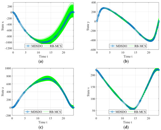 Employing the same MCS-based presentation method as in the previous case, the state trajectories of deterministic MDSDO and the state trajectories of the design variables subject to uncertainty are shown in Figure 9. In the 1e5 MCS samples, 4967 samples did not satisfy all the constraints. Thus, the optimization result obtained using MDSDO did not meet the reliability requirements.