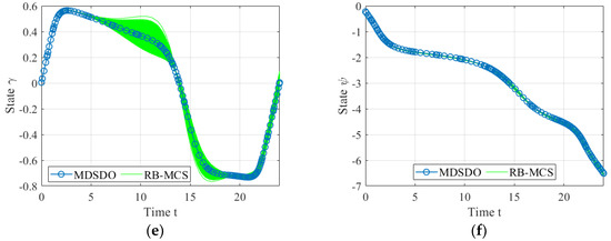 To clearly illustrate the influence of uncertainty on the state trajectories, the optimized deterministic state trajectory and the state trajectories affected by uncertainty are shown in Figure 6 with different lines. On the basis of the uncertainty information of the design variables, MCS was employed to generate 100,000 samples, and the corresponding state trajectories were obtained using the trajectory deduction method, shown as green lines in the figure. The blue lines with circlular labels are the deterministic state trajectories.