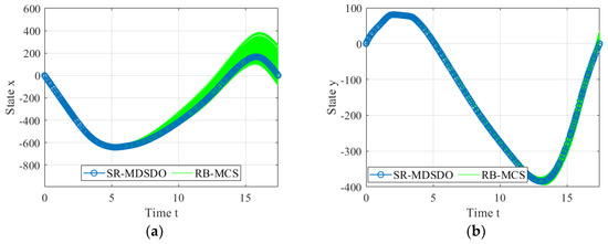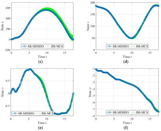 The state trajectories of the C-MDSDO optimization result are shown in Figure 10. As can be seen by comparing Figure 9 and Figure 10, the trajectory violation situation is significantly improved, especially in the trajectory of the state variable and the state variable . The design variables scheme, the objective function performance, and the failure probability are compared in Table 4. Comparing the results of the MDSDO and the C-MDSDO approach, the failure probability dramatically decreased from 49.67% to 0.09%, which meets the reliability requirement. Furthermore, the optimization objective value decreased from −0.4461 to −0.9050.