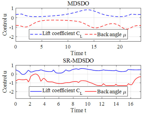 As shown in Figure 11, the control strategy completely changed as a result of considering reliability, which made the glider turn back to the starting point in a shorter time, whereas the control curves were not as smooth as for the original solution. Additionally, as a result of the difference between the control strategy of the C-MDSDO and MDSDO approach, the trajectories of the state variables of the MDSDO method were different to those obtained by the C-MDSDO method.