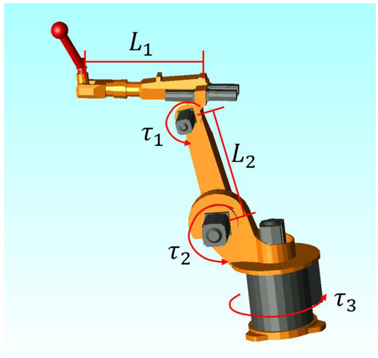 This case is derived from a point-to-point control problem of a three-degree-of-freedom robot arm [20], which contains six state variables and three control variables . The structural diagram of this robot arm is shown in Figure 12.