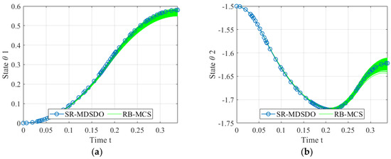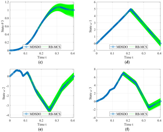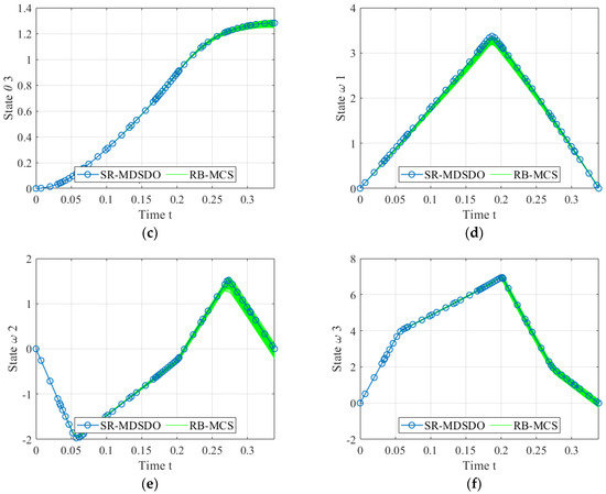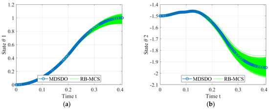 The same state trajectory presentation method was used here to demonstrate the effect of uncertainty on the state trajectory of the robot arm in Figure 13. With the influence of uncertainty, the angle of the final state of the robot arm varied greatly. Moreover, the state variables represent the angular acceleration of the arm, which means that the arm was not stationary at the endpoint under nondeterministic conditions. When the end position was converted using Formula (18), approximately 30.8% of the MCS samples indicated that the end position error was greater than the threshold, which demonstrates the unreliability of the MDSDO solution and shows that reliability-based MDSDO is required.