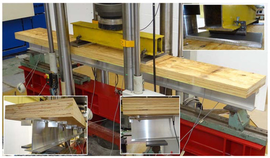 The authors observed one distinctive mode of failure in all of the tested beams (Figure 12). When the collapse load was applied, the veneers separated from each other in the LVL panel sections subjected to tension. Then, the veneers cambered near the loading plates in the LVL panel sections subjected to compression. At the serviceability deflection limit (L/250 = 10.8 mm), the load reached ca. 30% of the failure load. The deflections of the specimens were large because of the low values of the modulus of elasticity for aluminium and LVL. The Young’s modulus of aluminium (70 GPa) is three times lower than that of steel (210 GPa). For this reason, the deflection of the tested beams was large. However, in the presented tests, the LVL slab width was limited by the dimensions of the laboratory stand. The LVL slabs were located between the columns of the testing machines. The dimensions of the LVL panel and the cross-section of the aluminium beam were selected to obtain the neutral axis located in the LVL. In the case of the floor, the effective LVL slab will be wider, and the girder will be higher. As a result, the deflections will be lower. Therefore, the combination of aluminium and timber is beneficial. The transformed slab area for the cross-section of an aluminium–timber composite beam is approximately three times larger (n = 70.0/14.0 = 5.0) than the transformed slab area for the cross-section of a steel–timber composite beam (n = 210.0/14.0 = 15.0). This means that the second moment of area of an ideal cross-section of a composite beam is larger for an aluminium and timber composite beam than for a steel and timber composite beam. Due to this fact, the impact of the low modulus of elasticity of aluminium on large deflection may be decreased.
