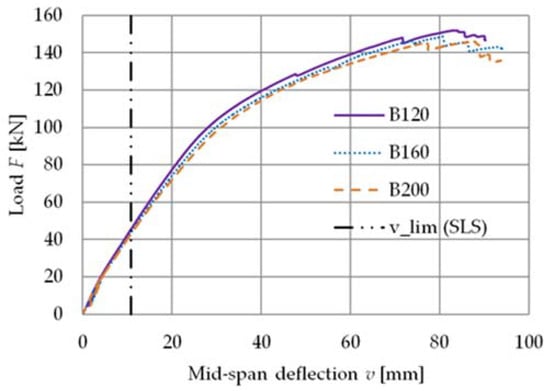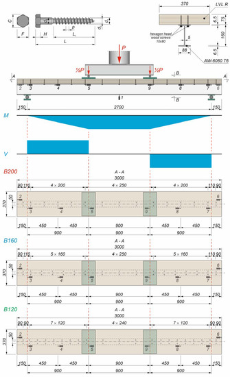 The beams were tested using an Instron 8505 Plus machine (Instron, High Wycombe, Buckinghamshire, UK). Each composite beam consisted of an LVL slab and an extruded beam made of an AW-6060 T6 aluminium alloy. The dimensions of the analysed beams were identical. However, the number of shear connectors and their spacing were different (Figure 2). Nine linear variable differential transformers (LVDTs) were used to measure the deflection and the slip between the LVL panel and the aluminium beam. A spreader beam was used to obtain pure bending of the composite beams between the loading points (when the shear from the dead load was not taken into account). The composite beams were located on roller supports. Steel plates were used in each support to prevent the local yielding of the girder flange. The 10 mm clearance holes were drilled through the top flanges of the aluminium beams. The diameter of the pre-drilled holes in the LVL slabs was 7 mm. The pre-drilled holes made it easier to install the screws. The transverse screw spacing was 50 mm. The longitudinal spacing was different for each beam (i.e., 120 mm, 160 mm, and 200 mm). Based on the connector spacing, the tested beams were designated as B120, B160, and B200. The authors of this paper used a torque wrench (Sandvik Belzer, IZO-I-100, 10–100 N·m, Sandvik, Portlaoise, Ireland) and a torque moment of 40.0 N⋅m to install the screws. Due to the fact that the torque wrench was used, all screws were tightened with the same torque moment and LVL was not crushed during screw installation. The loading procedure consisted of two steps. In step one, the composite beams were loaded to ca. 20 kN and then unloaded to ca. 5 kN. In step two, the beams were loaded up to the failure point. In step one, the clearances in the beam connections were reduced. In each step, a displacement control regime and a piston velocity of 1.0 mm/min were used to evaluate the behaviour of the analysed beams after the failure load had been achieved.