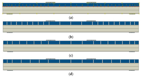 The numerical models: The composite beam with full shear connection (a), the B120 beam (b), the B160 beam (c), the B200 beam (d).