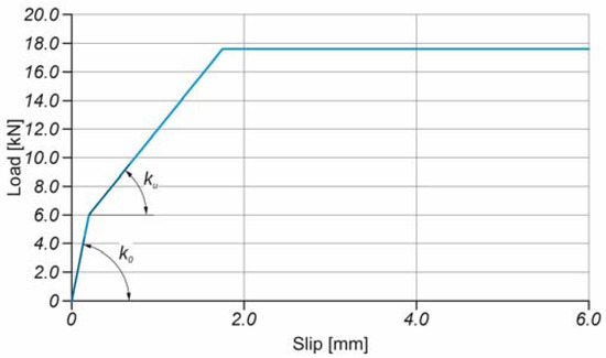 Discrete connections were used to model shear connections and to take slip into account. Discrete connections are often used in numerical models because they provide reasonable accuracy in reflecting the behaviour of the real structure [66,67]. At each point corresponding to the locations of the screws, the LVL slabs and the aluminium girders were connected using zero-length translator-type connectors. This type of connector makes it possible for the connected elements to move only in one direction (i.e., in the longitudinal direction). For each discrete connection, the forces and displacements from Figure 4 were used. The slip modulus ku was calculated from Eurocode 5 [68]: