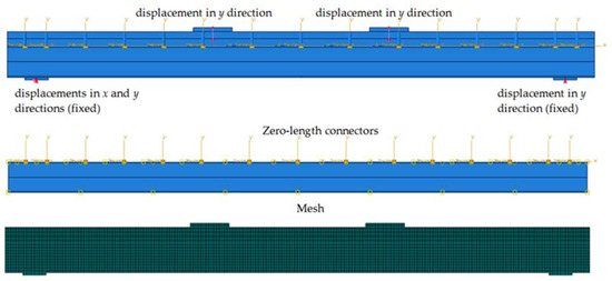 Additionally, steel elements representing the screws were embedded in the LVL slabs to consider the presence of the screws in the slabs. The loading and supporting steel plates, the aluminium girders, and the LVL slabs were modelled using 4-node bilinear plane stress quadrilateral elements with reduced integration and hourglass control (CPS4R). The screws were modelled using T2D2 linear line elements. The mesh size did not exceed 5 mm. The interaction between beam parts was captured by surface-to-surface “hard” contacts and friction contacts. In the case of the LVL–aluminium interface, the friction coefficient equal to 0.3 was adopted, just like for the LVL–steel frictional interaction [52,69]. In the case of the steel–aluminium interface, a friction coefficient equal to 0.3 was used. Figure 5 presents the boundary conditions used in the numerical analyses.