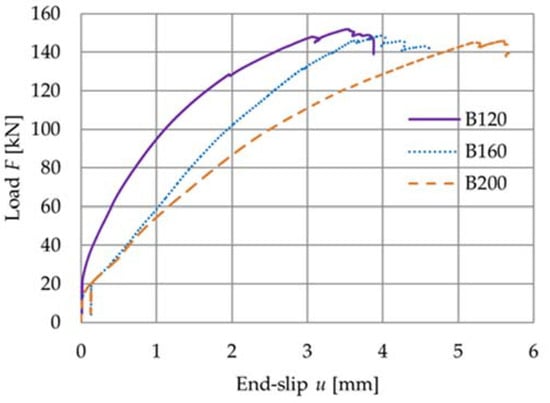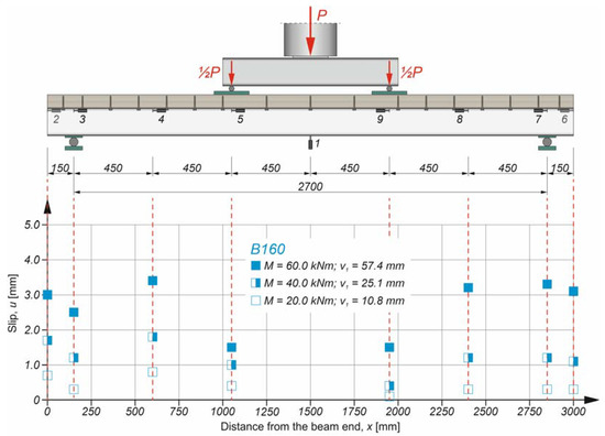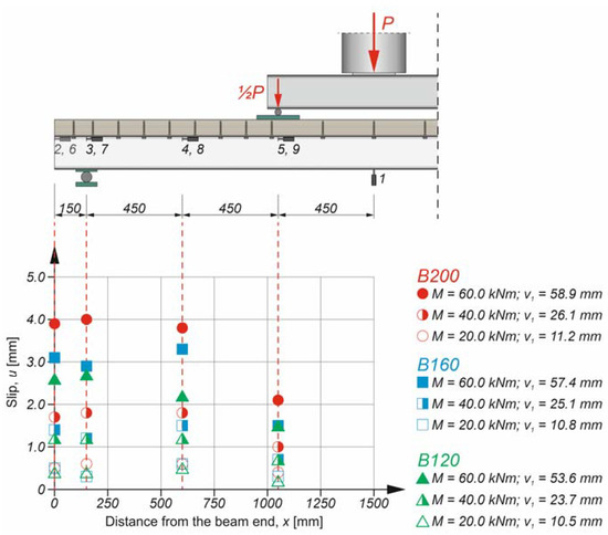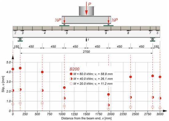 Figure 11 presents the comparison of the mean slip values in the interface of the analysed beams. The mean values of the slip were calculated considering the slip values from the left and right sides of the beams. The degree of shear connection had an impact on the slip value. Beam B200 had the highest slip value, which resulted from the lowest value of the degree of shear connection.