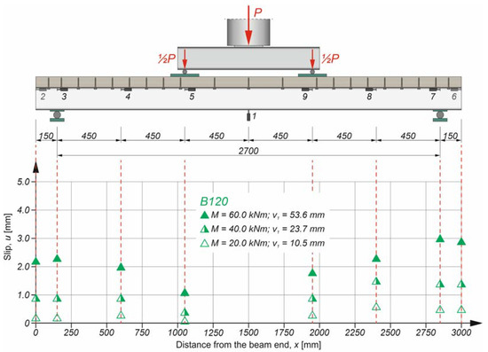 Figure 8, Figure 9 and Figure 10, present the slip distribution in the interface of the analysed beams. The slip distribution was not constant because the highest value of the slip was near the support. The obtained slip distribution curve is typical of composite beams with flexible connections [70].