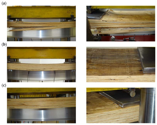 Failure modes of the aluminium–timber composite beams: B120 (a), B160 (b), B200 (c).