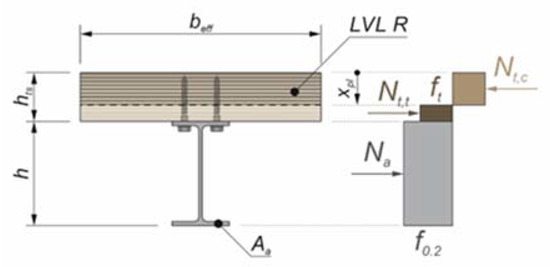 The calculations of the plastic resistance of the aluminium–timber composite beam were conducted using the stress block method for the steel–concrete composite beams (Figure 13) and are presented in Table 4. The timber subjected to tension was additionally taken into account. Due to fact that the LVL slabs were subjected to both tension and compression in the composite beams with partial shear connections, the bending strength of the LVL was used as the LVL strength. This assumption was made based on the fact that timber structural elements are stronger in bending than in compression or tension [71]. This is because when a timber structural element is subjected to bending, only about 10% of its volume is subjected to high stresses, whereas when a timber structural element is subjected to pure tension or compression, all of its volume is subjected to the same value of stress [72].