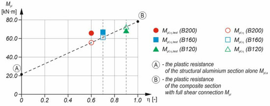 The plastic resistance to bending of the aluminium–timber composite beam with partial shear connection Mpl,η was calculated based on the method for the steel and concrete composite beams presented in [27]: