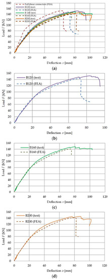 The load versus deflection responses from the test and the numerical analyses: All curves (a), B120 (b), B160 (c), B200 (d).
