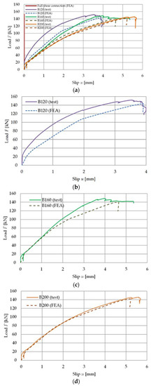 The load versus slip responses from the test and numerical analyses: All curves (a), B120 (b), B160 (c), B200 (d).