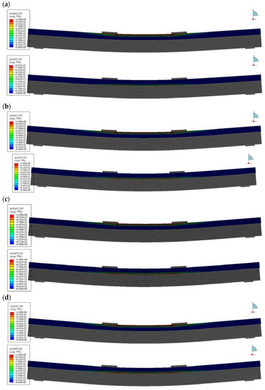 The areas of damage initiation. Due to the compression of the fibres and due to the tension of the fibres for the ultimate load (Mpl = 68.7 kN·m) and the composite beam with full shear connection (a), for the ultimate load (Mpl = 64.4 kN·m) and the B120 beam (b), for the ultimate load (Mpl = 63.3 kN·m) and the B160 beam (c), for the ultimate load (Mpl = 63.9 kN·m) and the B200 beam (d).