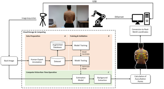 Figure 1 shows the system overall architecture. It is possible to verify that there is, first, a data preparation phase (A), consisting of the creation of the dataset and then the model training (B). Next, autonomous real-time auscultation is performed (C), where first the offset between the camera and robot alignment is obtained. Next, the image of the person’s back is obtained from the camera, and this is inserted into the trained model and a model to perform background extraction from the image.