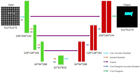 First of all, it was necessary to train a prediction model to predict the landmarks present on the backs of the individuals. U-Net was used for this purpose. It is an architecture developed by Olaf Ronneberger et al., for biomedical image segmentation, in 2015 at the University of Freiburg, Germany [28], and is one of the most widely used approaches currently in any semantic segmentation task. It is a fully convolutional neural network that is designed to learn from little training data. This is an improvement over the existing fully convolutional networks (FCN) developed by Jonathan Long et al., in 2014 [29]. U-Net is a U-shaped network architecture composed of two parts: an encoder network and a decoder network. This model merges high-level features and low-level features through a skip connection between the two parts, which improves the ability to segment details in the image. In this work, the preformed classification network MobileNetV2 [30] was used as the encoder network, forming the MobileNetV2-UNet. The decoder network comprises four deconvolution layers and three inverted residual blocks, so that the input and output dimensions of the MobileNetV2-UNet are identical. The architecture is shown in Figure 2.
