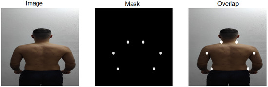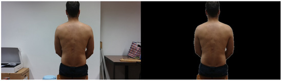 Taking the frame from the person’s back, as illustrated on the left side of Figure 7, it is then resized to 512 × 512 × 3 pixels, since this is the input of the model. Then, the prediction model for image segmentation in humans, already trained and available on the Internet, was used. This model predicts a mask that corresponds to the outline of the person, and with this, it is possible to perform the extraction of the image background.
