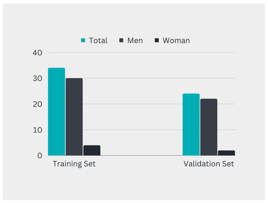 Once the network was formed, it was necessary to create a dataset composed of a training set and a validation set. These were separated in folders with the back images and their respective masks, both with a size of 512 × 512 × 3 pixels. In Figure 3, it is possible to observe a small example of a back image with its respective mask, that is, the reference points. The mask was developed manually by an experienced professional and followed current medical recommendations and standards. Since the initial dataset with the back images was made up of only 172 images for training, the data augmentation techniques described in Figure 4 were used. These techniques are useful for improving the performance and results of the machine learning model by forming new and different examples to train datasets. If the dataset of a machine learning model is rich and sufficient, the model performs better and more accurately. Furthermore, for machine learning models, data collection and labeling can be tiresome and costly processes. Transformations on datasets, using data augmentation techniques, allow these operational costs to be reduced [32,33]. In the end, the created dataset had 6536 back images in the training set, where 34 different female and male persons were present, and 24 back images, from different people, in the validation set. In Figure 5 it is possible to observe the distribution of volunteers in terms of gender at the creation of the dataset.