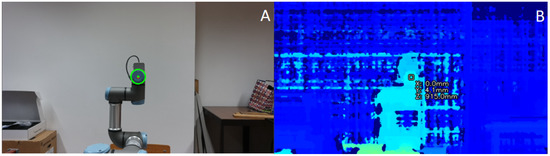 Calculation of the alignment offset between the robotic arm with the camera. On the left (A), photographic image frame, with the middle of the gripper represented by a green dot (center of the green circle). On the right (B), depth image frame with the middle of the gripper (green dot) represented by a square, with related spatial coordinates, near bottom right corner vertex.