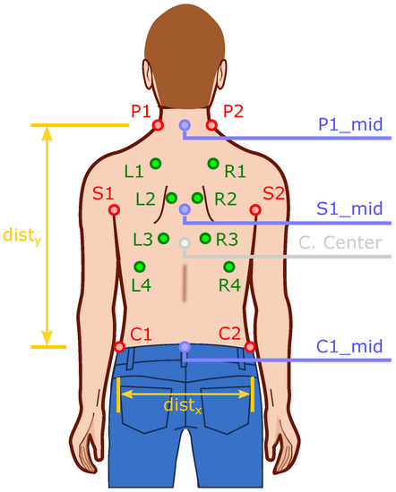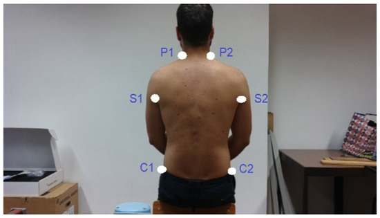 Keypoints on the person’s back, represented with white circles. Labels attributed according to: P for neck, S for armpit, C for waist, 1 for left side and 2 for right side.
