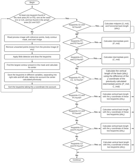 The variable corresponds to whatever point is found in the neck area, i.e., if both are found, or , , depending on which one is found. This algorithm is detailed in the flowcharts shown in Figure 10 and Figure 11.