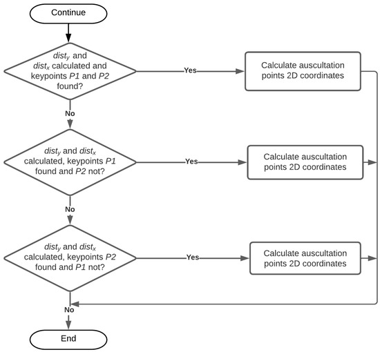 The algorithm is designed in such a way that it will only proceed to the next step when it has found at least four reference points, two of which must be the points and , because that is the only way it can calculate the horizontal length of the back. It must find a point at the neck ( or ) and another one at the bottom of the back ( or ), to be able to calculate the vertical length of the back. The calculation of the auscultation points’ 2D coordinates, represented in Figure 9 in green, are based on the measurements of the length of the back (vertical and horizontal). If these are successfully obtained, and depending on the key points found, the following equations apply: