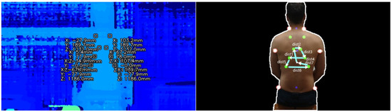 Next, the 2D coordinates of the reference points (key points) of the person’s back were obtained using the SimpleBlobDetector() function with the following parameters: filterByColor = True; blobColor = 255; minArea = 0.1; minCircularity = 0.01; minConvexity = 0.01; minThreshold = 1; minInertiaRatio = 0.01.